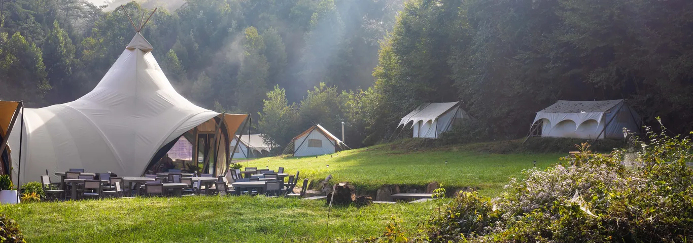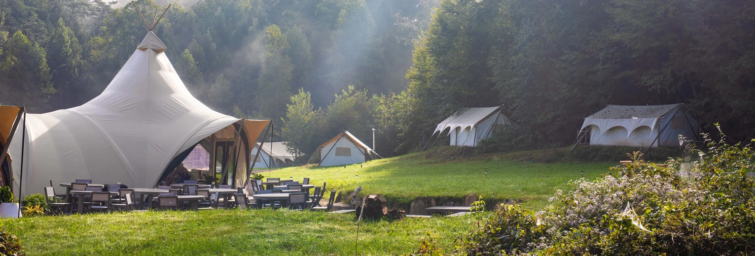 Je komt aan op de glamping. Geniet van de voordelen van kamperen, zoals de spectaculaire locatie, midden in de natuur! Daarnaast geniet je van veel comfort in de luxe tenten. Het beste van twee werelden dus!