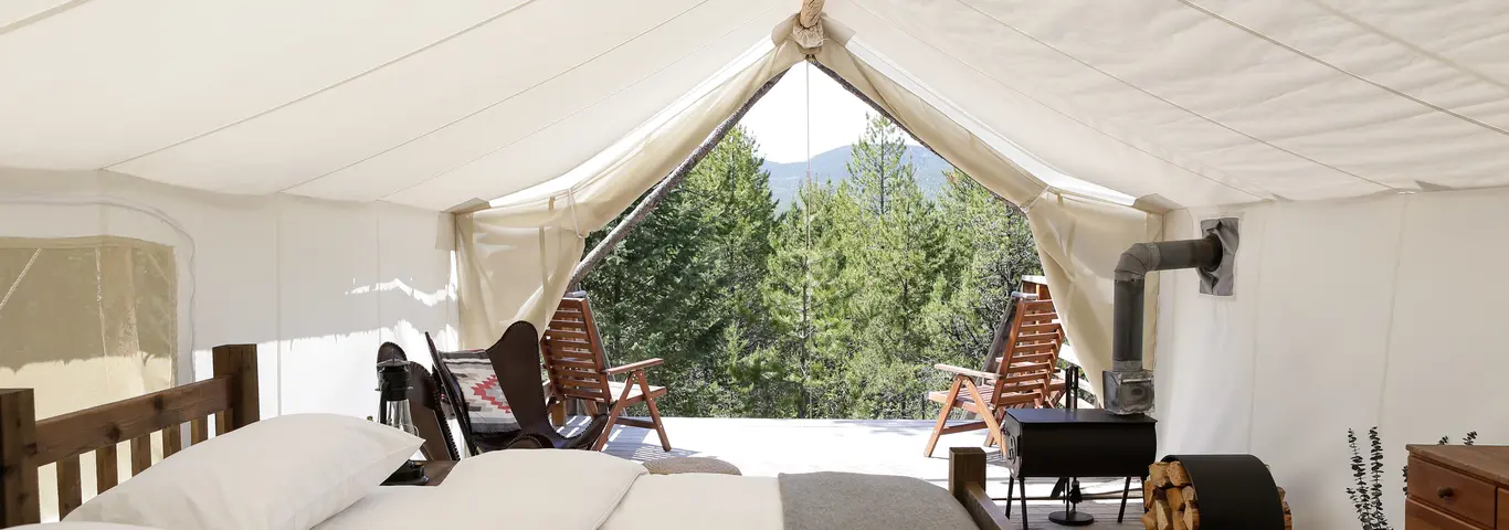 Glamping bij het Glacier National Park. Luxe compleet ingerichte tenten op een fantastische locatie tussen de bergen en nabij meren. In jouw tent sta je in nauwe verbinding met de omliggende wildernis, maar wel met comfortabele kingsize bedden en houtgestookte kachels om te relaxen na het verkennen van Montana’s buitenleven.