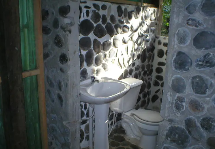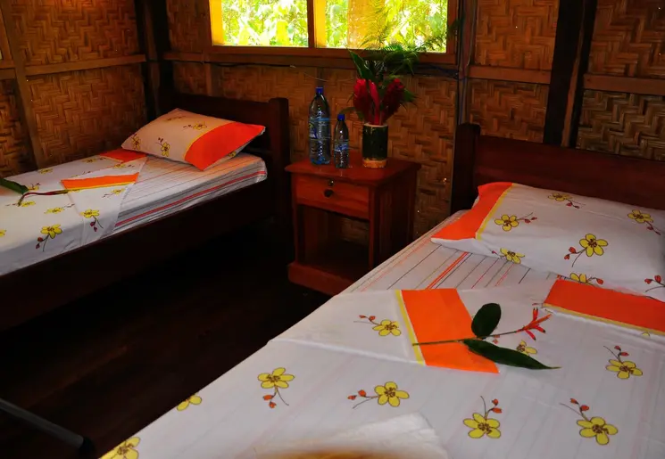 Lodge met bungalows in lokale stijl gebouwd. Zowel de vorm als de materialen zijn gelijk aan de huizen in het dorp.
