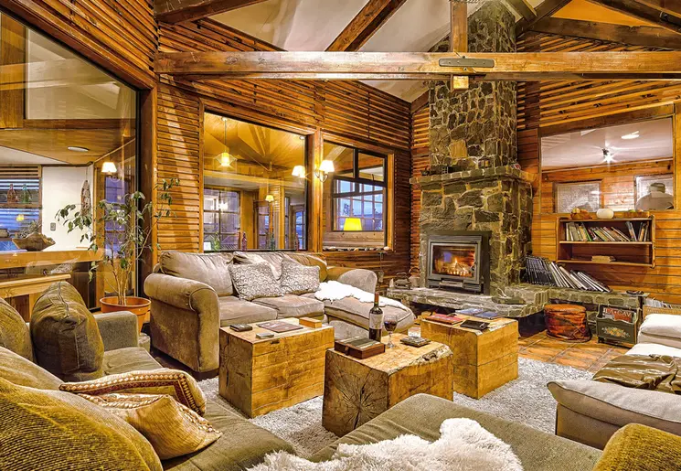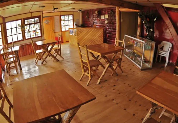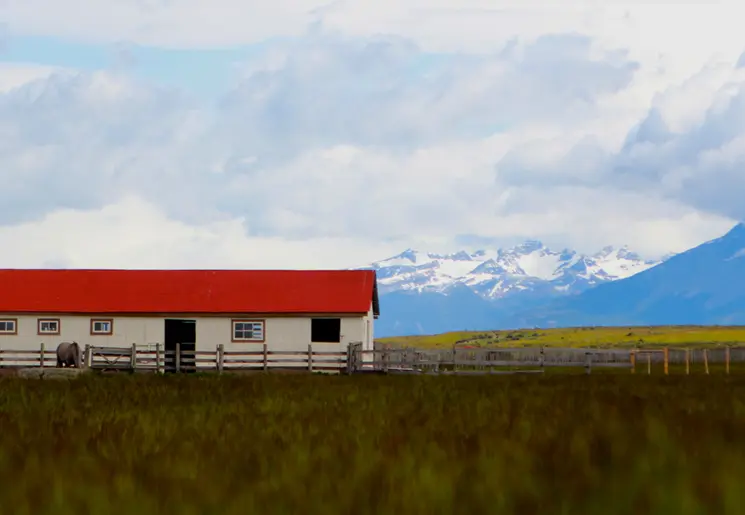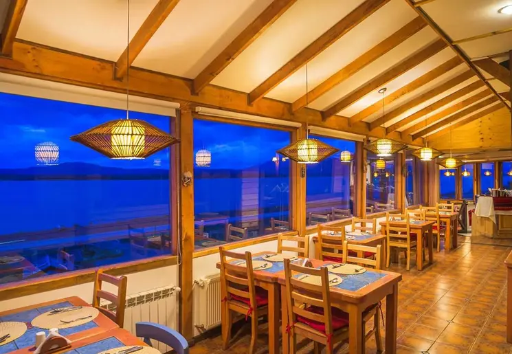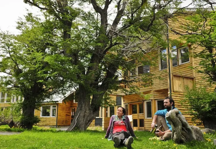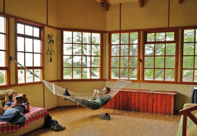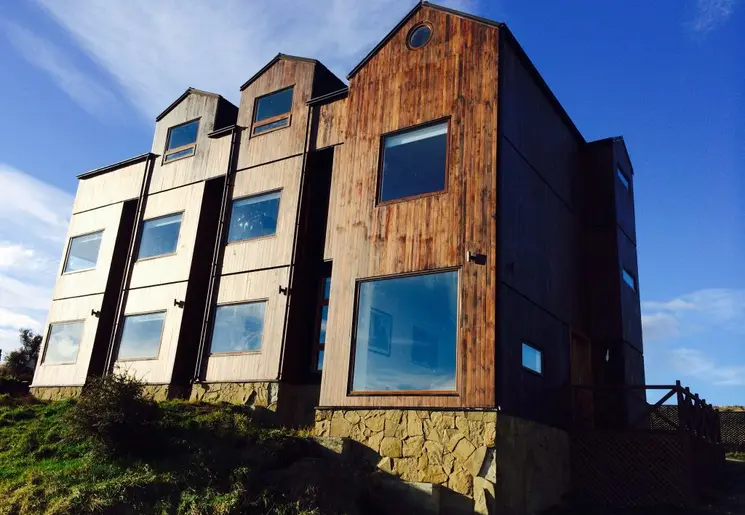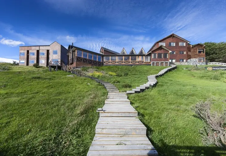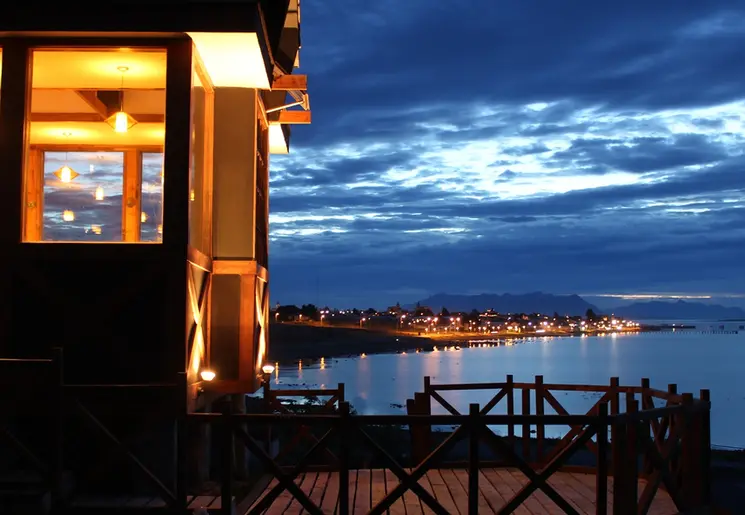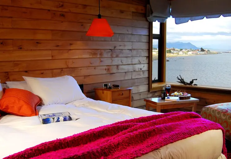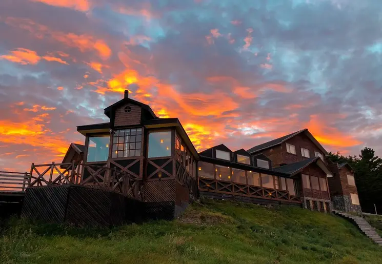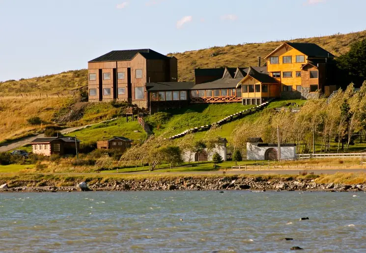 Houten gebouw aan een fjord. Het hotel zou zo maar op een ansichtkaart van Patagonië kunnen staan, zo typerend is het voor de omgeving.