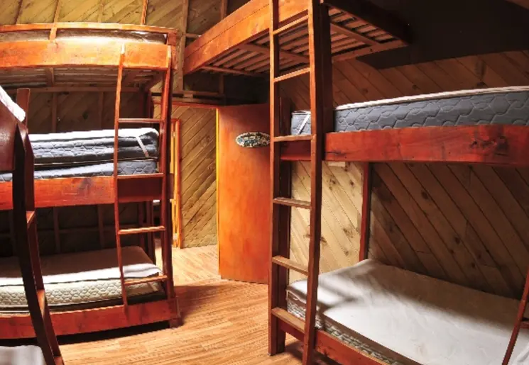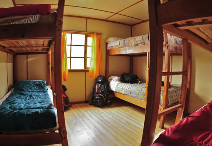 Houten huizen met slaapzalen waar je verblijft aan het begin van de W-trekking.