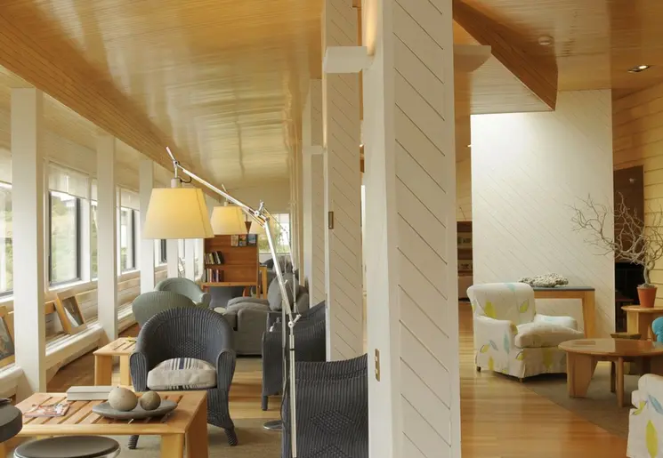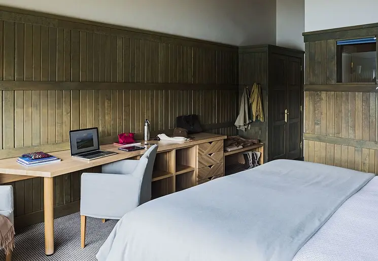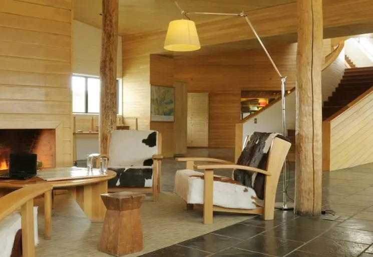 Houten gebouw aan een fjord. Het hotel zou zo maar op een ansichtkaart van Patagonië kunnen staan, zo typerend is het voor de omgeving.