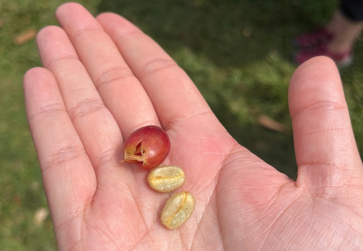 Dan krijgen we allemaal een rieten mand om, deze gebruikten ze vroeger bij het plukken van koffie. We lopen naar de ‘coffee nursery’ en bekijken de verschillende fases van de koffieboon tot aan de koffieboom. Met allemaal een ‘bes’ in onze handen knijpen we twee bonen eruit, welke we planten. Na negen maanden, de zogenaamde ‘pregnancy’ van de koffieplant, worden onze zaadjes weer tegen de berg aan geplant om door te groeien tot volwaardige koffieboom mét koffiebessen.