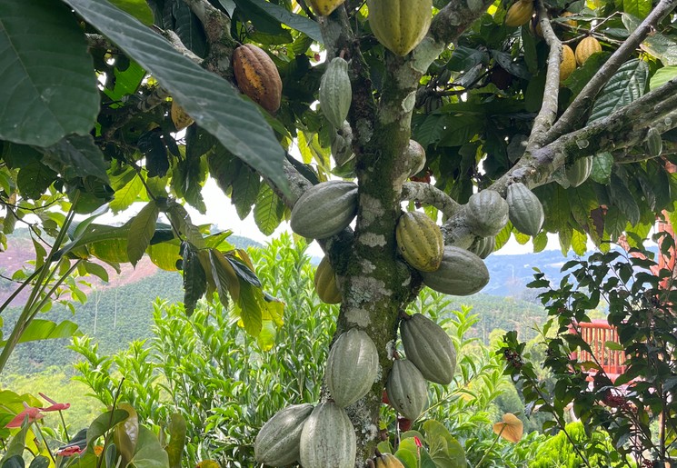 Tijd om met onze ouderwetse manden te gebruiken! Een stuk de berg op, langs allerlei bomen en fruitsoorten: avocado, mango, cacao, lychee etc. Wat verbouwen ze hier veel! De grond is ook zeer vruchtbaar van de omliggende vulkanen in deze omgeving, waaronder de actieve ‘volcán Ruiz’.