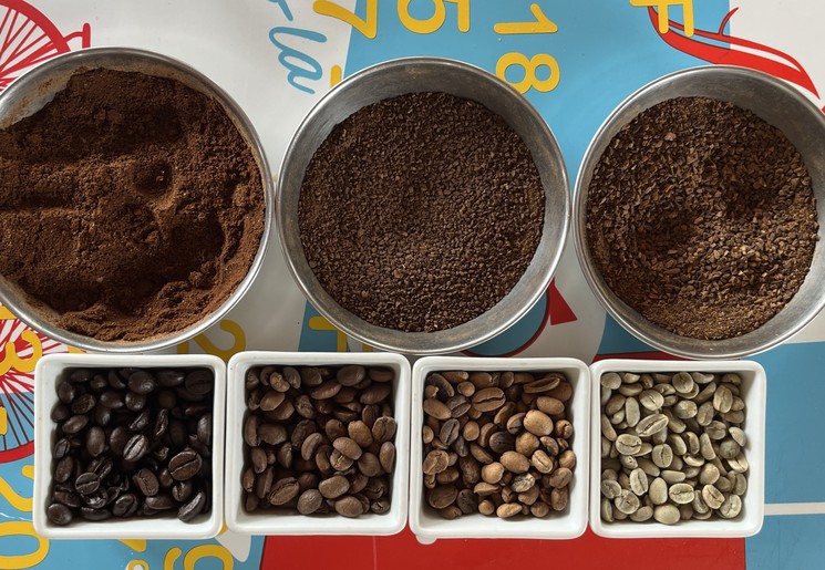Terug in het koffiehuis. We zien de vier verschillende geroosterde koffiebonen: