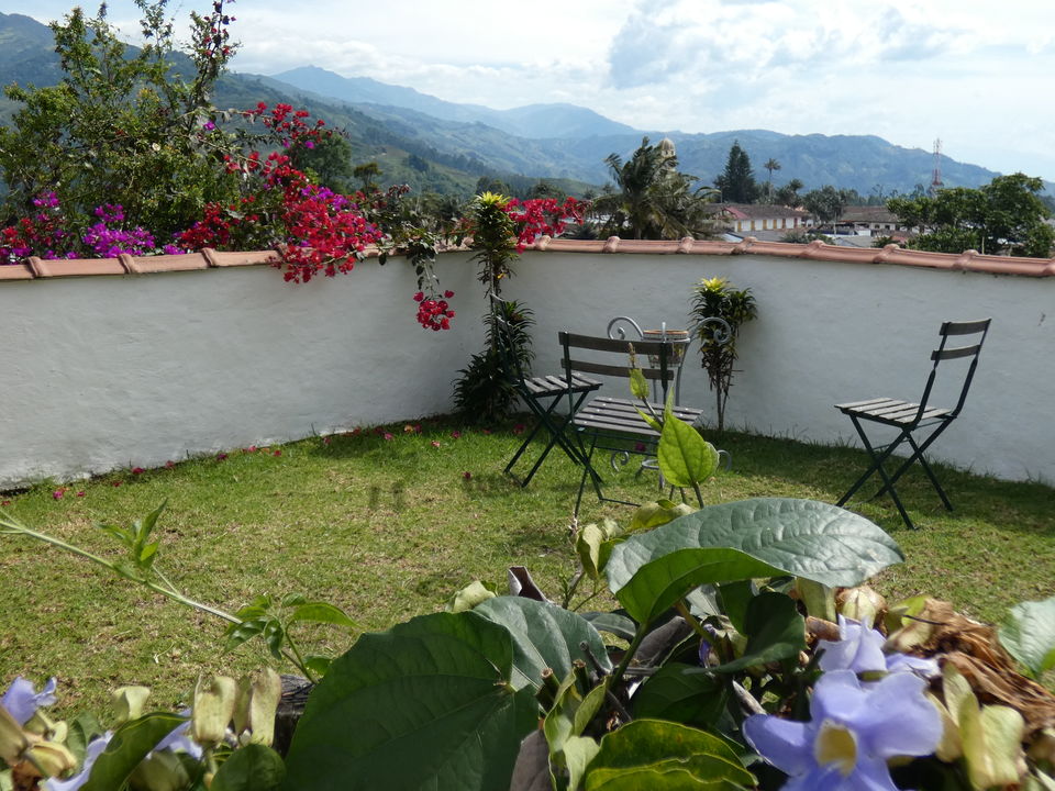 Het is een klein stukje lopen naar het centrum. Maar op één blok van het hotel zie je de eerste winkeltjes en restaurantjes al aan weerszijden van de straat. Zodra je het hotel verlaat sta je al in het historische centrum van Salento. Dit is zo’n leuk plaatsje. Waar je ook kijkt, overal zie je de oude huizen in het wit met felle kleuren voor de kolommen en kozijnen. Het doet echt Caraïbisch aan. Er is een groot plein, er zijn enkele terrasjes en Salento vormt een prima uitgangspunt om de koffieregio te verkennen.