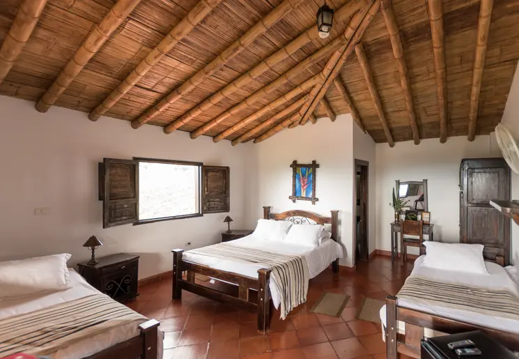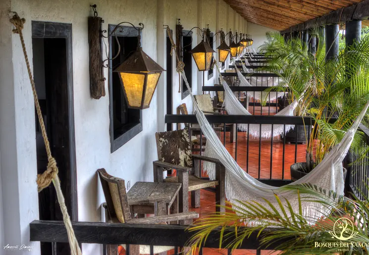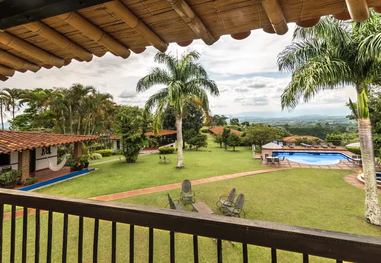 Schommelend in één van de hangmatten, kijk je uit over de tuin. Een koffiefarm in het groen en met een fijn zwembad erbij.