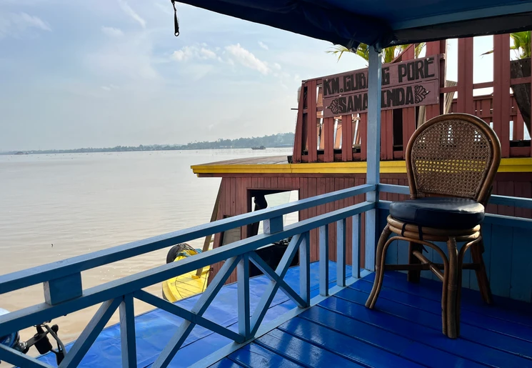 De Mahakamrivier is heel breed bij Loajanan, er is veel bootverkeer en bebouwing en industrie aan de oevers. Het gevoel van natuur komt later pas.
