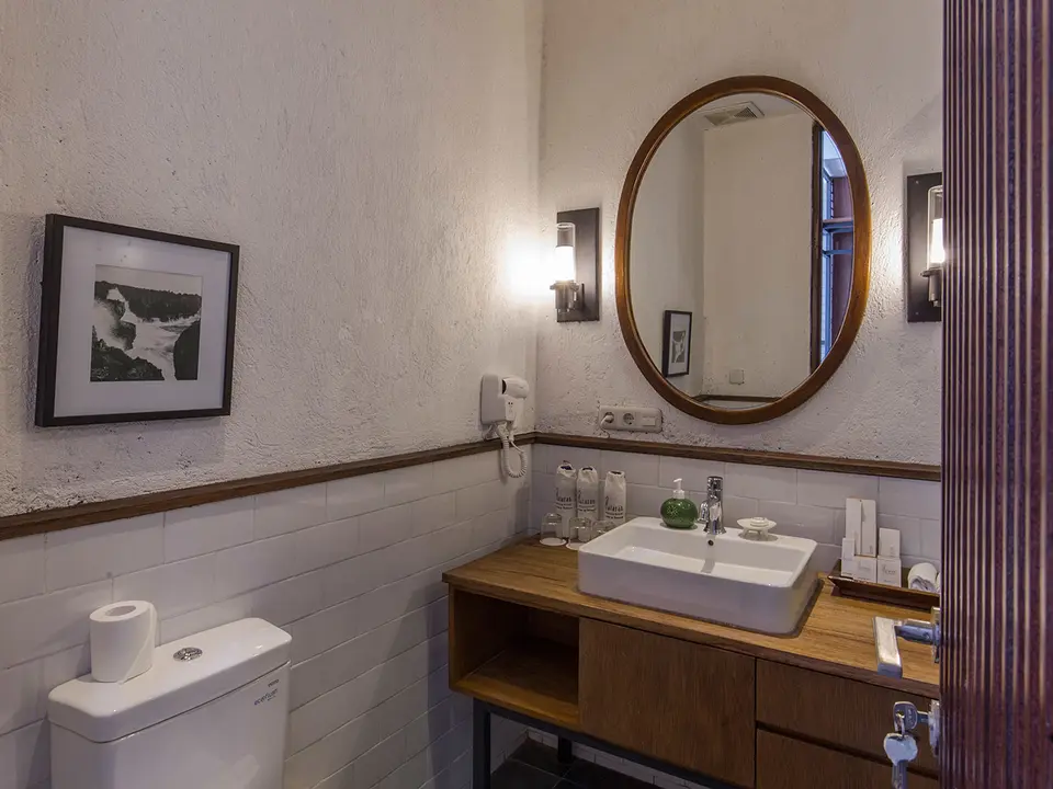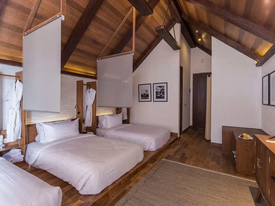 ruime suite die met veel lokaal hout is ingericht. Er kunnen twee personen slapen in het kingsize bed dat hier staat. In de badkamer is een badkuip.