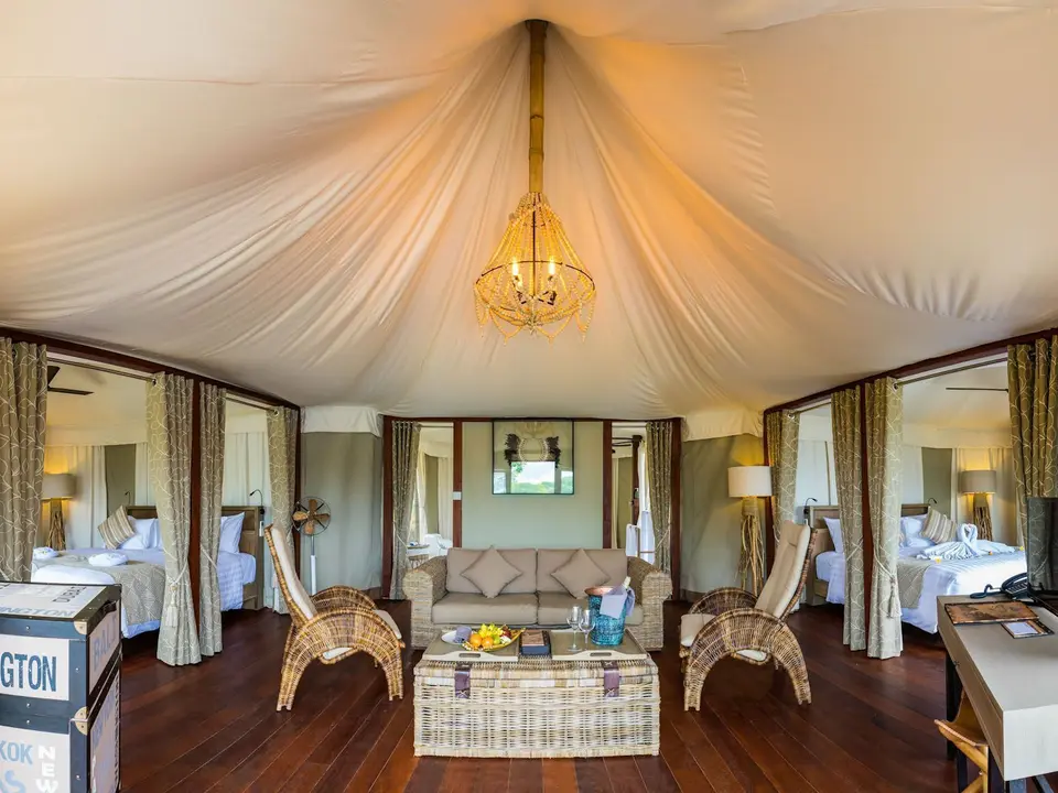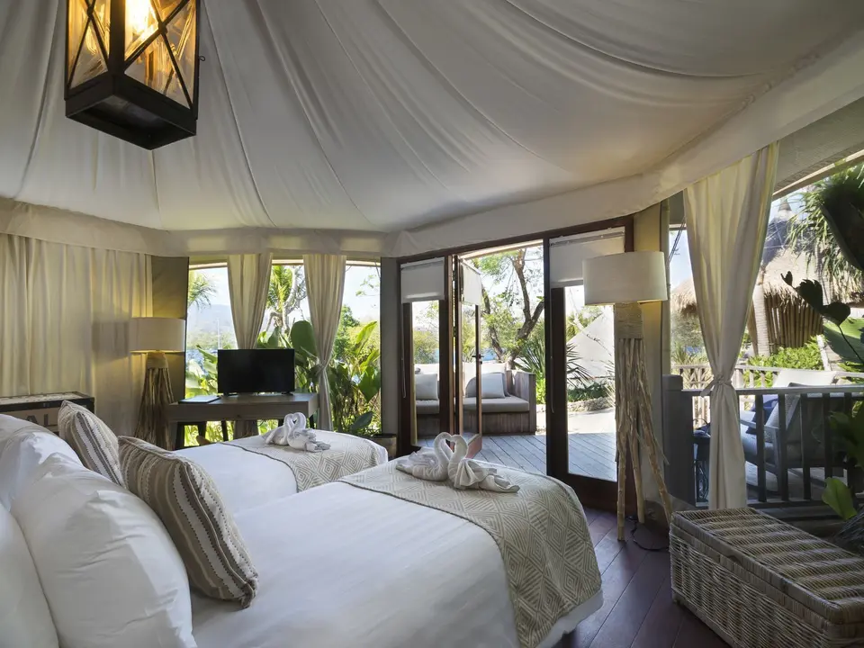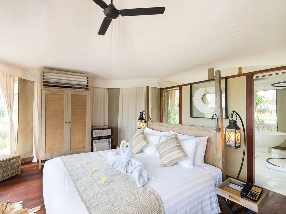 Er zijn 24 Beach camp tenten, 2 klif tent villa’s met 1 slaapkamer en 2 klif tent villa’s met 2 slaapkamers. Alle kamers hebben een televisie, minibar/koelkast, kluisje, airconditioning, plafondventilatoren, badkamer met douche of bad, haardroger en koffie- en theefaciliteiten.