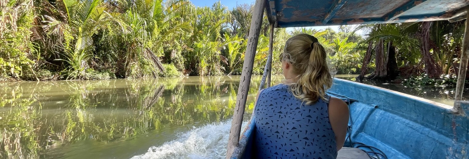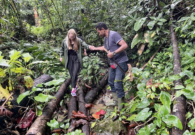 We maken ons klaar voor wat avontuur in de jungle en gaan samen met een gids, die de jungle van binnen en buiten kent, op pad. Verwacht geen goede paden, het is soms echt klimmen en klauteren. De gids maakt voor ons een wandelstok die helpt voor evenwicht en met een machete maakt hij de weg begaanbaar. We zijn omgeven door torenhoge bomen met lianen en af en toe stoppen we om te genieten van het uitzicht en water dat uit de lianen komt te drinken, heerlijk verfrissend.