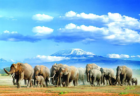De sneeuwtoppen van de machtige Kilimanjaro torenen boven de laaghangende nevel uit. Brede acaciabomen staan in een groen savannelandschap. Een kudde olifanten trekt voorbij. Lake Amboseli is de inspiratie voor de naam van het Amboseli National Park. In het droge seizoen verdampt het meer, waardoor een zoutvlakte overblijft. Na een regenbui verandert de kristalbodem in een moerasgebied met talloze kraanvogels en flamingo’s. Toch is dit meer niet waarom het park zo beroemd is geworden: dat is te danken aan de Kilimanjaro, de hoogste berg van Afrika.