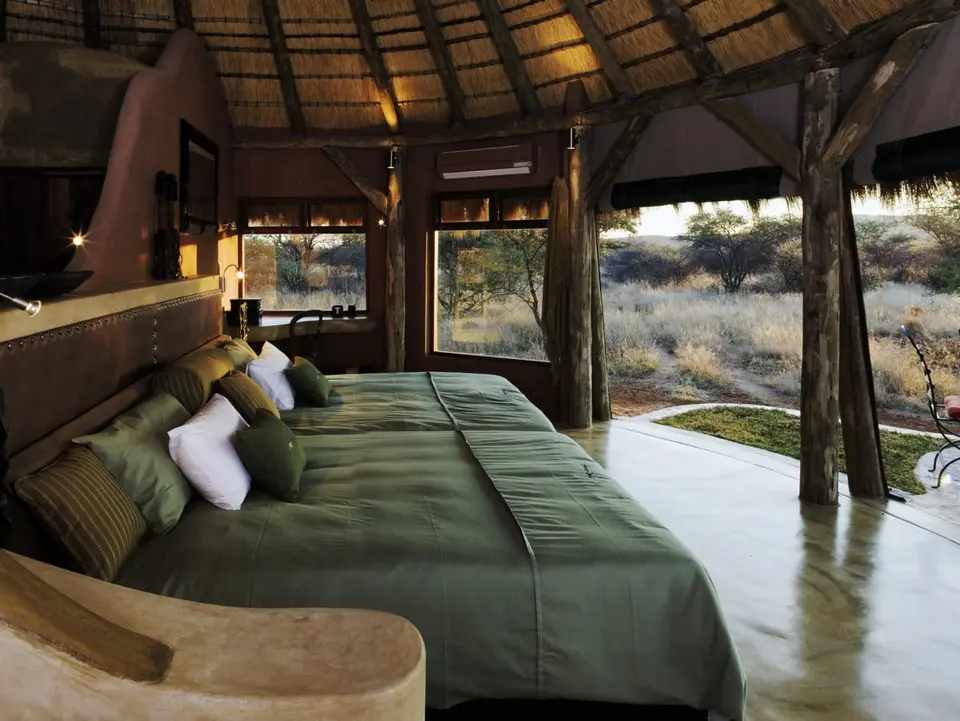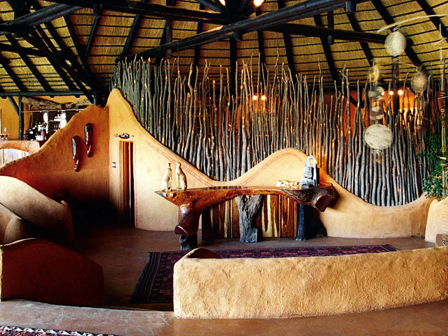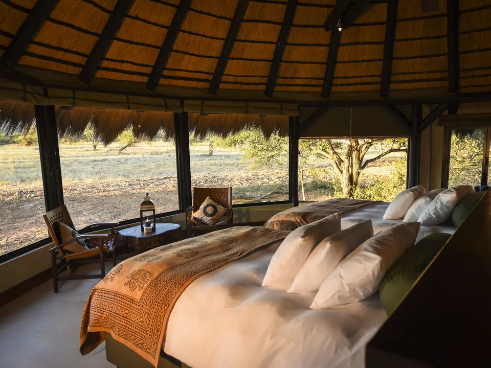 - Chalets. De 8 ronde chalets zijn deels van steen, canvas en riet. Ze staan 80 tot 100 meter uit elkaar, zodat je privacy is gewaarborgd. De aardse kleuren op de wanden maken het nog sfeervoller. Grote ramen zorgen ervoor dat je eerste uitzicht bij het ontwaken de bush is, beter wakker worden bestaat niet. De badkamer heeft een douche en toilet. Ultiem relaxen en genieten van het uitzicht doe je vanuit je sala (open stenen gedeelte met riet overkapt) die voorzien is van twee relaxbedden met comfortabele kussens, minibar en koffie/theefaciliteiten. Voor je chalet staat een zogenaamd birdbath, vogeltjes vliegen af en aan en zorgen voor een vrolijk gefluit de hele dag door.