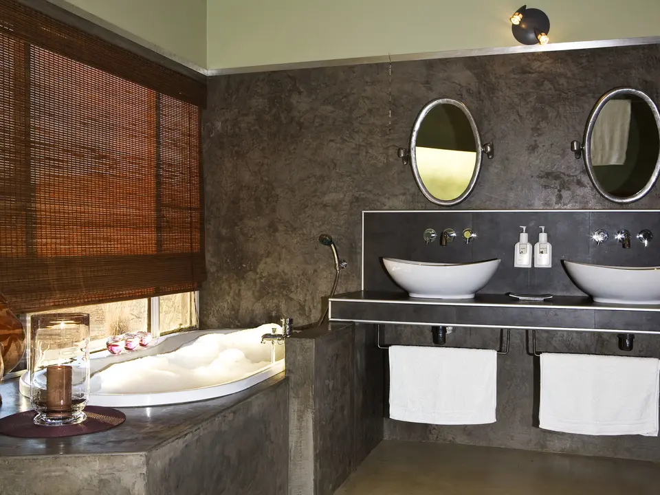 - Juniorsuite. Er is maar ruime 1 juniorsuite. Opgetrokken uit steen, strak en modern in Afrikaanse stijl met veel oog voor detail ingericht. Het biedt een magnifiek uitzicht over de vlaktes. Er is een slaapgedeelte, een aparte lounge, open haard en badkamer met bad en toilet. Speciaal is de buitendouche, zo kun je onder de sterrenhemel douchen!