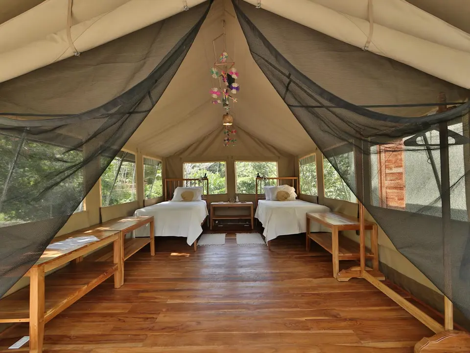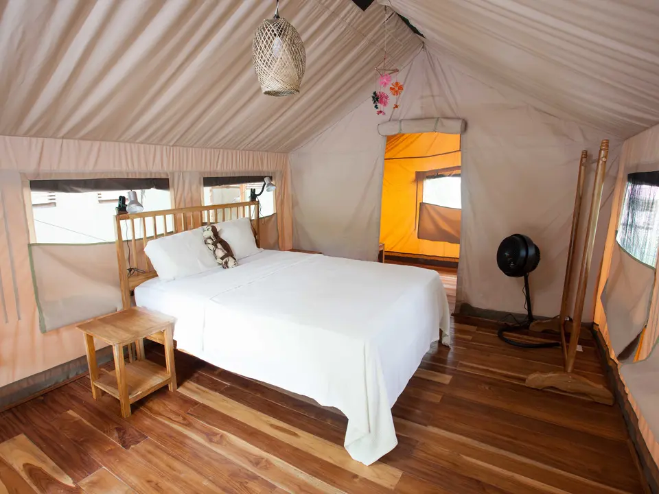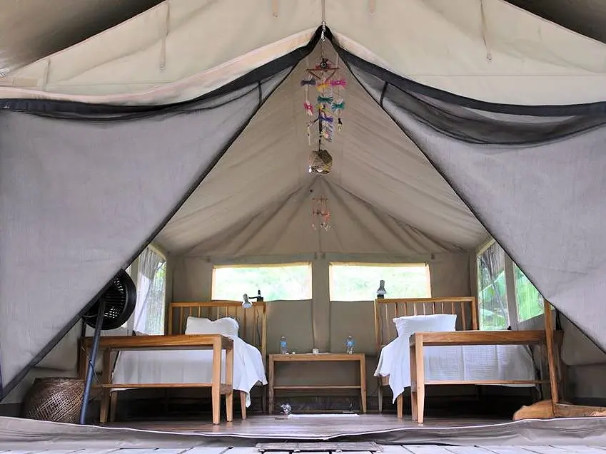 De standaard suite tent is al prima. Er is meer dan voldoende ruimte om je spullen neer te zetten. De tenten kunnen compleet afgesloten worden, maar als je het dekzeil over de ramen opent, is het licht. Er zijn tenten met een tweepersoonsbed en tenten met twee eenpersoonsbedden. De vloer van de tenten is van hout. Er staat een ventilator en er hangt een lamp.