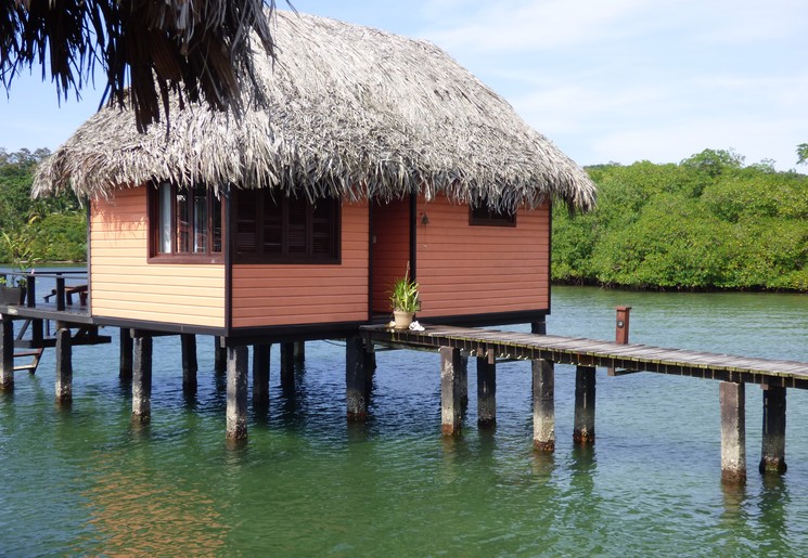 Huisjes op palen in het glasheldere water. Kleinschalig en rustig.