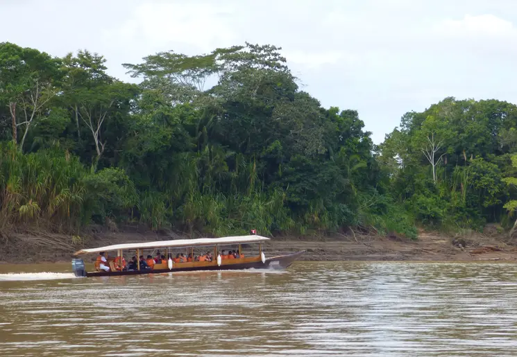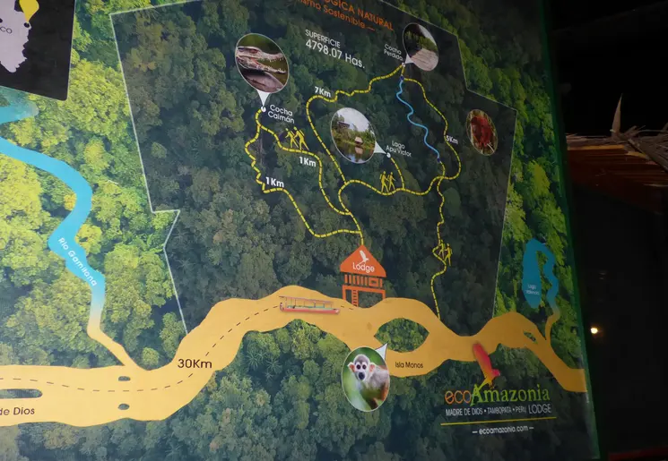 Je vaart van Puerto Maldonado naar de lodge over de Madre de Dios-rivier. Na een lunch daar, ga je op stap met de gids. Je maakt een korte hike door de jungle. Onderweg zie je reusachtige bomen, krioelende mieren en overvliegende vogels. Je wandelt naar een lagune waar kaaimannen in zwemmen. Behalve de kaaimannen zagen wij onderweg ook rode brulapen en een tarantula. Even opfrissen van de klamme warmte in de jungle en het diner staat alweer klaar.