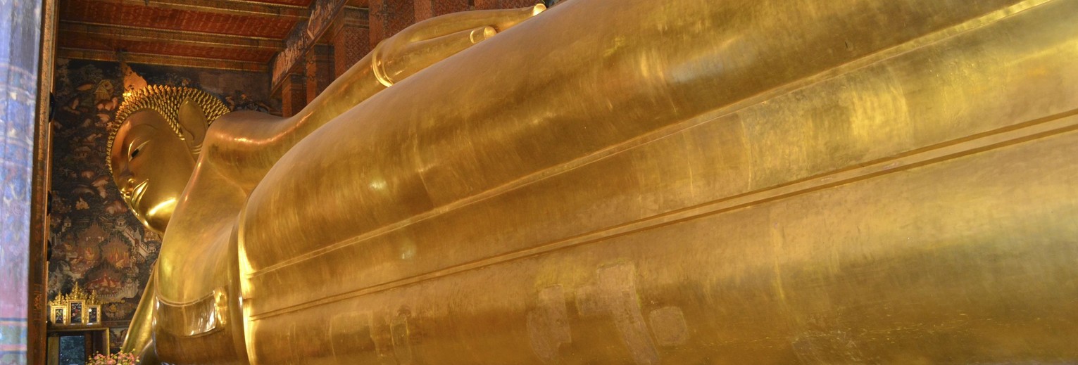 Wat Po is de oudste tempel van Bangkok en beroemd om de met bladgoud bedekte liggende Boeddha. Het hoofd rust op de rechterarm en pas 46 meter verder prijken de voeten, sierlijk ingelegd met parelmoer. Dagelijks lopen er vele mensen binnen om donaties te geven in de vorm van kleine muntstukken. Die hoeft men niet bijeen te sparen, er staat heel praktisch een muntenverkoopster op de hoek die graag als wisseldepot optreedt.