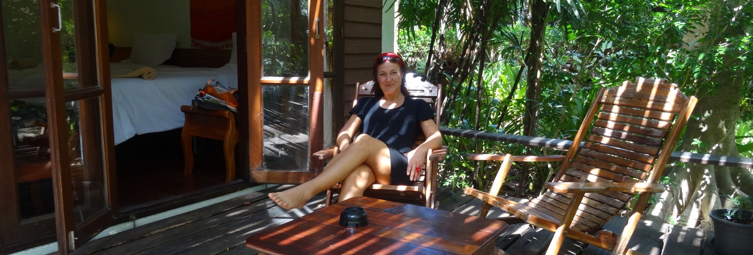 De aankomst met de ferry in Thong Sala is ontspannen. Het is een geoliede machine die zorgt voor goede doorstroom van de mensen die aankomen en vertrekken. Nog geen teken van krioelende partylovers, dat schept verwachtingen! In de taxi naar mijn hotel aan de noordwest kant van Koh Phangan durf ik lichtelijk enthousiast te worden. Er staan buffels te grazen onder de palmen, grote granieten rotsblokken liggen rommelig verspreid langs de weg. Lokale winkeltjes afgewisseld met motorbike-verhuur en restaurants vormen kleine dorpjes. Ik verblijf in Sunset Cove. Wat een heerlijke plek! Kleinschalig, prachtige tuin, bloemen en een strandje met palmbomen. Overdag is het hier in ieder geval heel rustig, nu nog de avond afwachten, misschien barst het feest dan los… Nee hoor, niets van dat alles. Haad Chaophao is easygoing en relaxed.